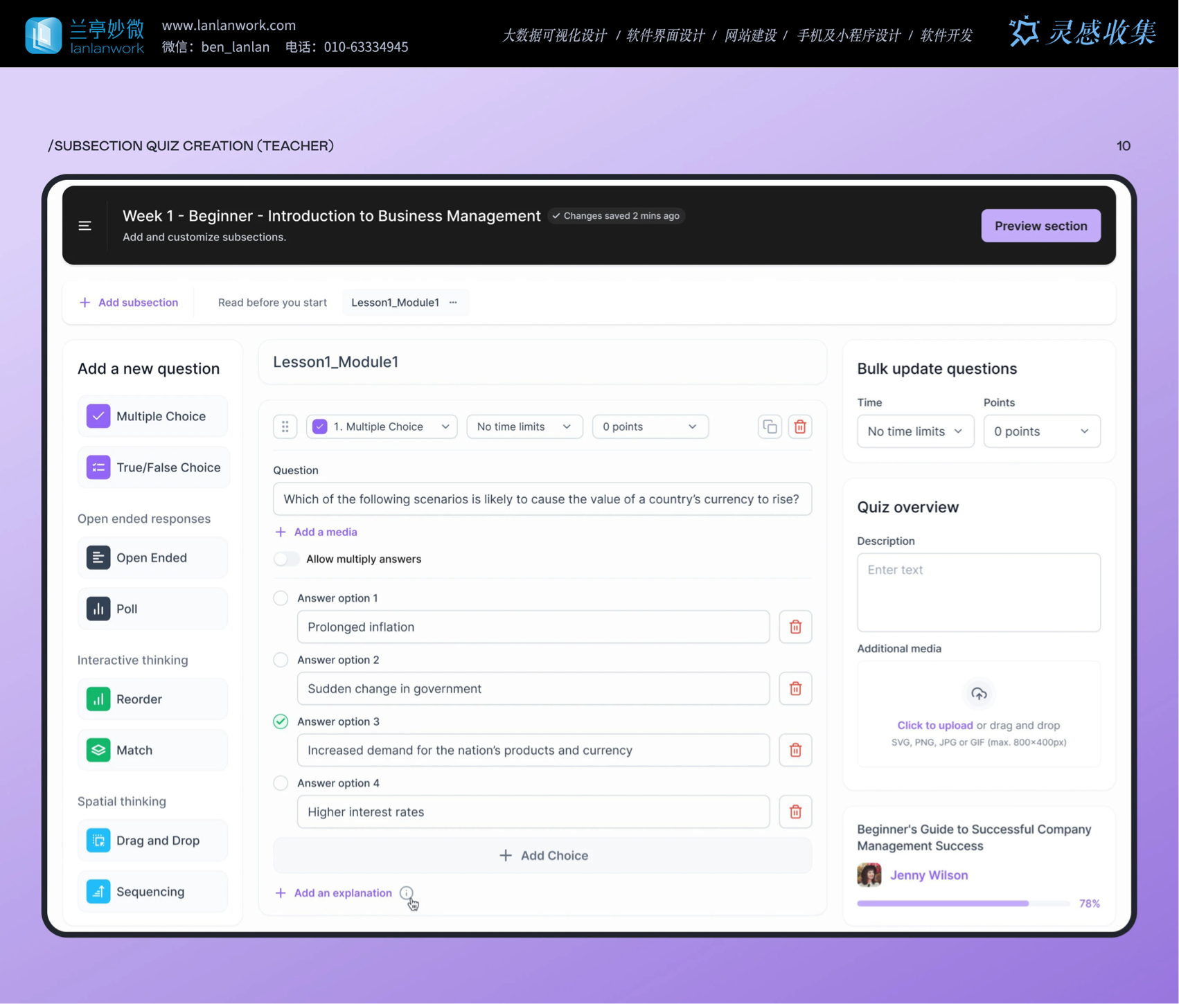 按鈕,操作反饋及時又明確;老師創(chuàng)建測驗時,能選多種題型,還能添加圖片等媒體、設(shè)置答題時間和分?jǐn)?shù),滿