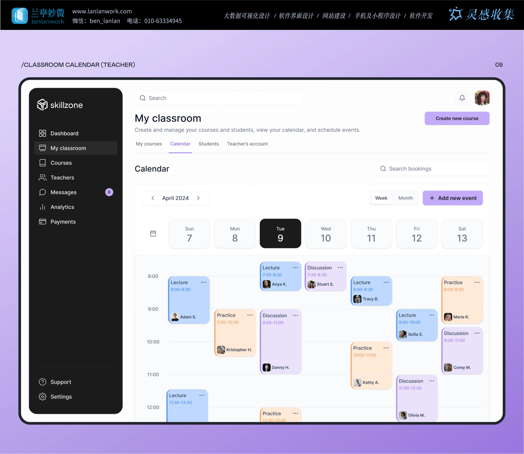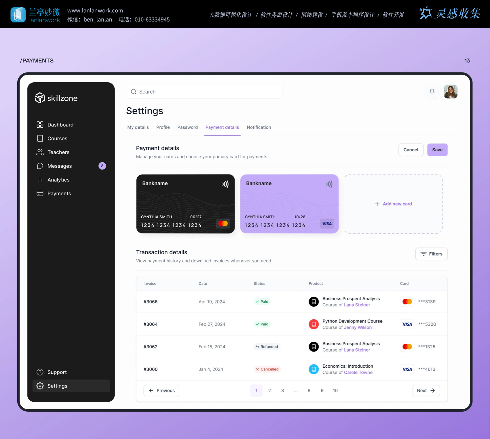Skillzone 選用柔和的紫色為主色調(diào),紫色常給人智慧、有創(chuàng)造力的的感覺,很符合教育的特點。再搭配簡潔的黑白