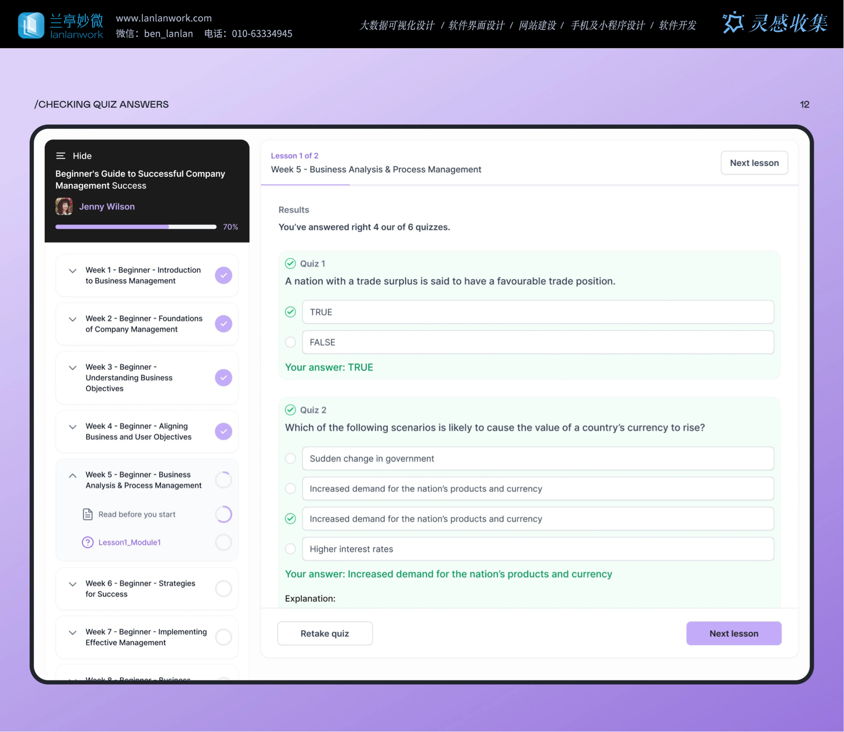 交互設(shè)計處處為用戶考慮。就說測驗功能,學(xué)生答題頁有 "Retakeequiz (重新測驗)""Next lesson (下一課)"