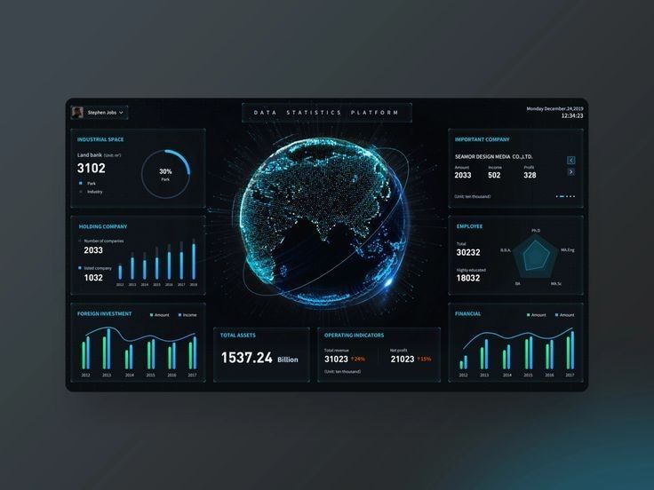 企業(yè)數據往往枯燥且復雜,而這類設計卻讓數據 “活” 了起來。深色背景與熒光色、科技藍的碰撞,既拉滿科技氛圍,又通過色彩區(qū)分數據維度,讓層級一目了然。環(huán)形圖、折線圖等可視化組件,把營收、用戶增長等數據動態(tài)展示,仿佛數據在 “講述” 企業(yè)故事。這讓我們思考:數據類 UI 不該只是 “數據的容器”,更應是 “數據的翻譯官”,蘭亭妙微在做類似設計時,也會努力讓專業(yè)數據變得更易感知、更能輔助決策。