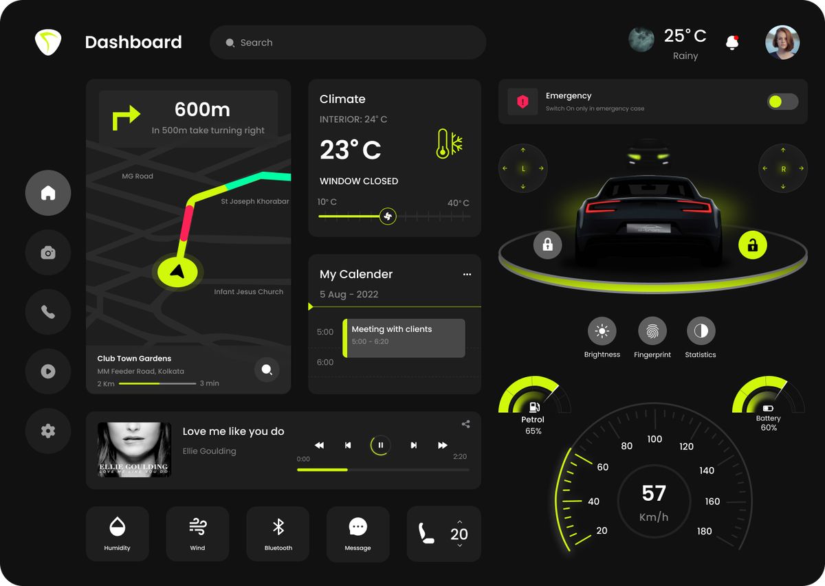汽車中控是用戶出行的高頻交互場景,設計不僅要 “能用”,更要 “好用且愉悅”。這類界面將導航、車況、娛樂等功能整合,深色主題搭配熒光黃交互元素,既避免強光干擾駕駛,又讓操作區(qū)清晰可辨。實時路況、車輛能耗的直觀展示,音樂播放的便捷控制,都圍繞 “駕駛場景下的高效交互” 展開。這和我們的設計理念不謀而合 —— 科技產品的 UI,應模糊 “工具” 與 “伙伴” 的邊界,讓每一次使用都成為舒適的體驗。