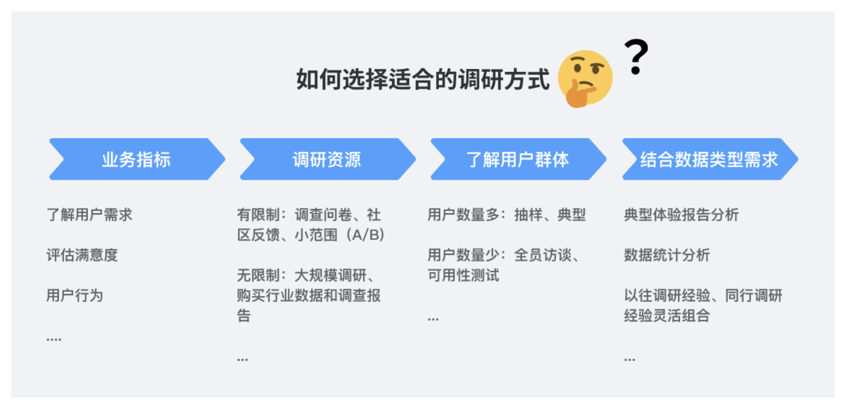 難點(diǎn)在于 “資源有限”—— 不可能每次都做全所有調(diào)研,需根據(jù)目標(biāo)選方法:比如要快速了解 “新用戶注冊(cè)痛點(diǎn)”,選 10 個(gè)典型新用戶做訪談,比做 1000 份問卷更高效。