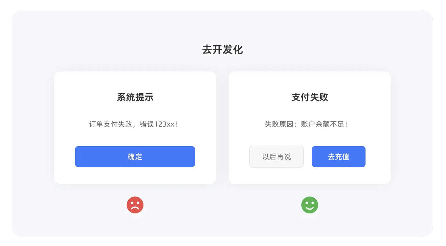- 拒絕負(fù)面詞匯:避開 “不要”“不能”“失敗” 等詞匯,用正向表達(dá)替代,“暫未找到結(jié)果” 比 “沒有符合條件的內(nèi)容” 更溫和。