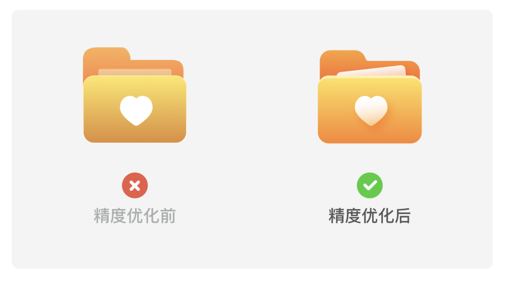 很多設(shè)計(jì)師認(rèn)為圖標(biāo)只要造型準(zhǔn)確就夠了,但恰恰是這些 “不起眼” 的小元素,最能暴露設(shè)計(jì)功底。以常見(jiàn)的文件夾圖標(biāo)為例,從 “能用” 到 “精致”,只需要 4 個(gè)關(guān)鍵調(diào)整: