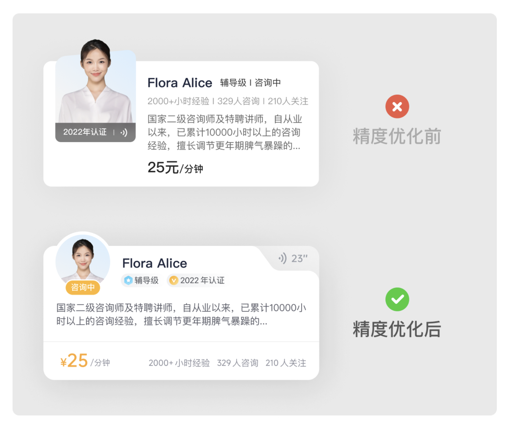 卡片中的關(guān)鍵數(shù)據(jù)(如咨詢(xún)費(fèi)用、經(jīng)驗(yàn)時(shí)長(zhǎng)、咨詢(xún)?nèi)藬?shù))需要重點(diǎn)突出,但要避免多個(gè)視覺(jué)焦點(diǎn)沖突??蓪①M(fèi)用 “25 元 / 分鐘” 改為 “¥25 / 分鐘”,放大字號(hào)并加粗;其他數(shù)據(jù)保持統(tǒng)一字號(hào),用間距區(qū)分,讓用戶(hù)一眼就能捕捉到核心信息,提升決策效率。