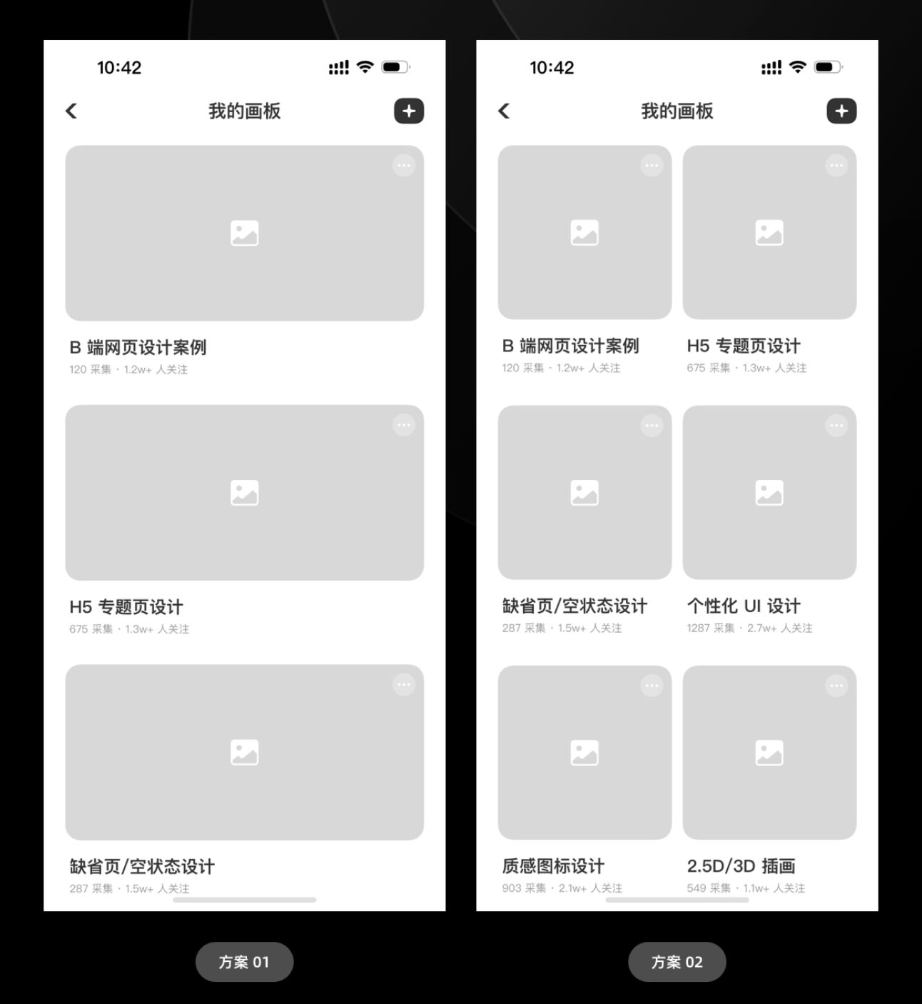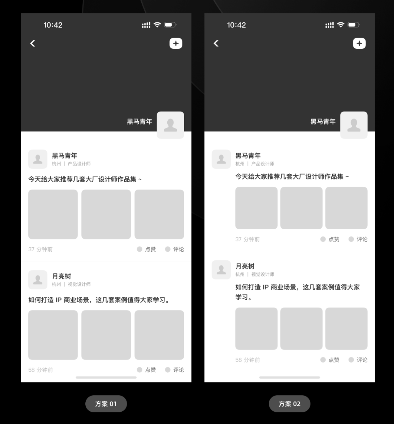 - 方案 02:左側展示發(fā)布者頭像與昵稱,右側展示動態(tài)內(nèi)容,強化用戶之間的關聯(lián)感