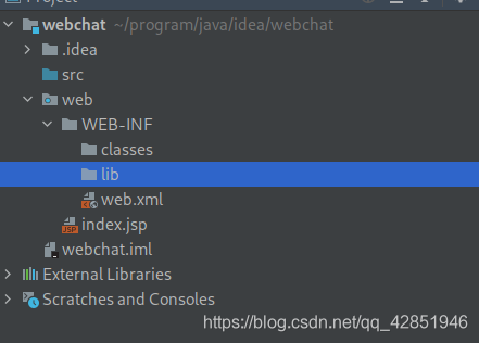 展開(kāi)工程名->web->WEB-INF,在WEB-INF下新建兩個(gè)文件夾,分別是classes、lib: