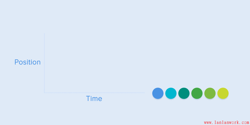 所有的APP動(dòng)畫都會用到動(dòng)畫曲線。我將試著去解釋如何閱讀它們并說明它們的含義。下面的例子中,運(yùn)動(dòng)就是勻速的,可以看到對象在相同的時(shí)間間隔中移動(dòng)了相同的位置。
