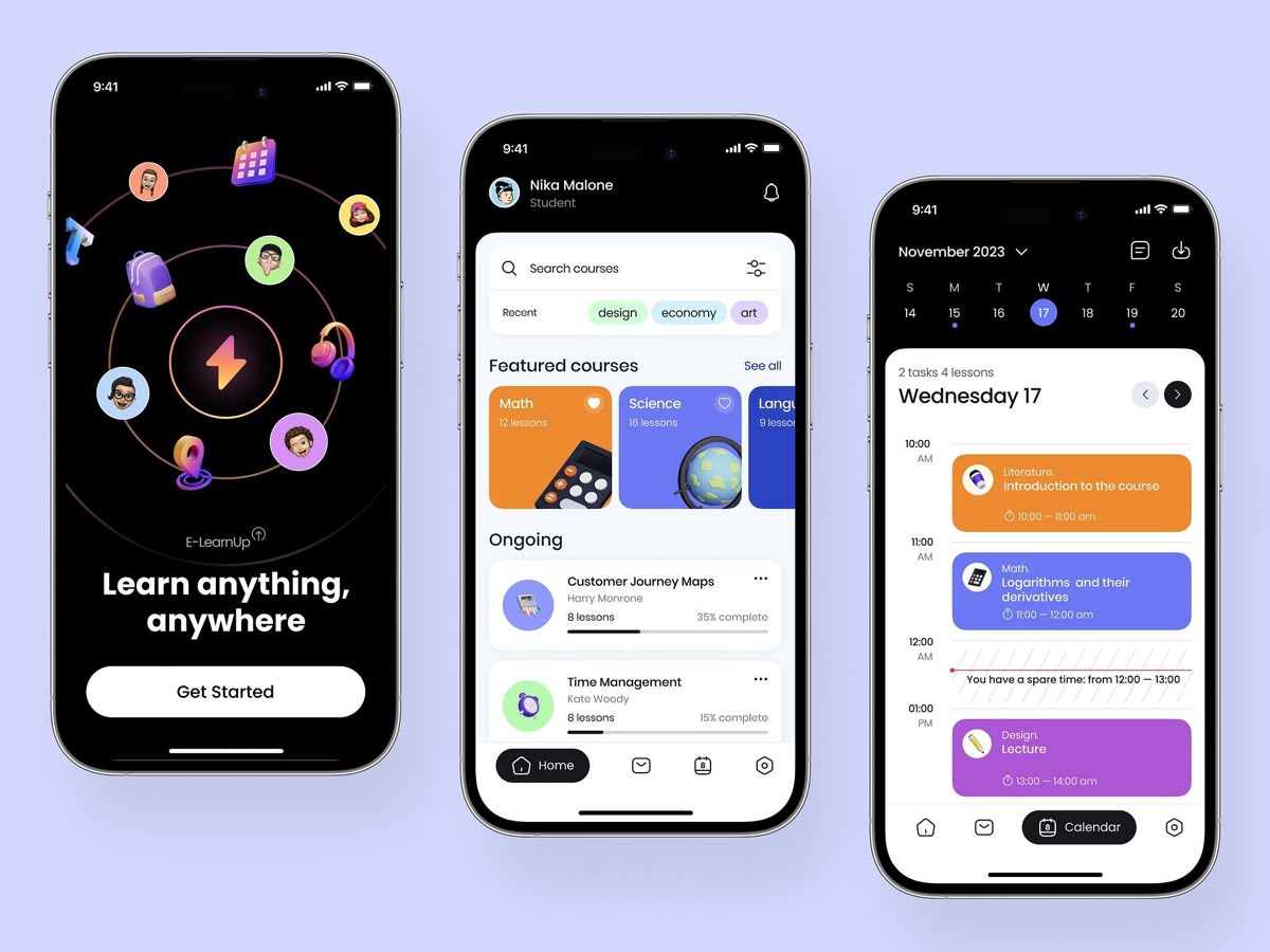 來(lái)看看這組設(shè)計(jì),色彩搭配既形成鮮明對(duì)比,又保持和諧統(tǒng)一,3D 元素的運(yùn)用增強(qiáng)了界面的層次感與視覺(jué)吸引力。在布局上,功能分區(qū)清晰明確,課程展示板塊與日歷時(shí)間管理板塊的排版直觀有序,能為用戶帶來(lái)流暢的使用體驗(yàn),高效適配學(xué)習(xí)場(chǎng)景的需求。